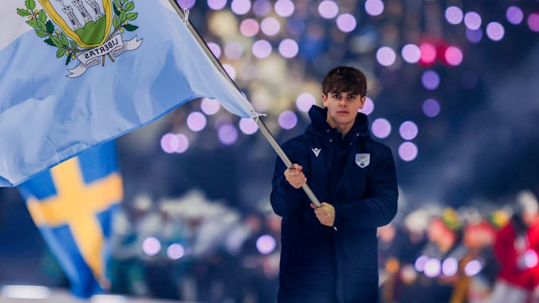 Mattia Beccari (Alpine Skiing) carries the flag into the stadium for the San Marino Youth Olympic Team during the Opening Ceremony at the Gangneung Oval. The Winter Youth Olympic Games, Gangwon, Republic of Korea, Friday 19 January 2024.