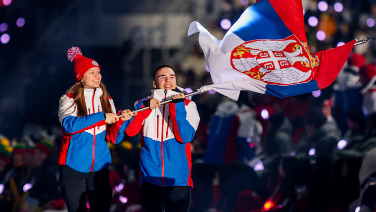 Luka Jasic (Short Track Speed Skating) and Hanna Braun (Biahtlon) carry the flag into the stadium for the Serbia Youth Olympic Team during the Opening Ceremony at the Gangneung Oval. The Winter Youth Olympic Games, Gangwon, Republic of Korea, Friday 19 January 2024.