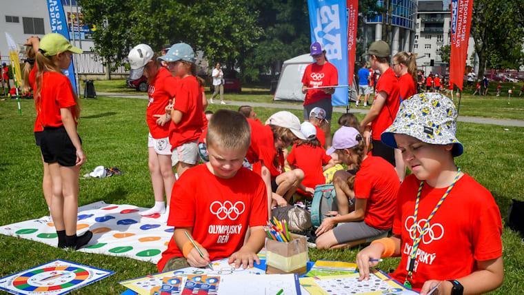 IOC / Greg Martin. The President with Slovak Olympians Peter Korčok and Matej Tóth.