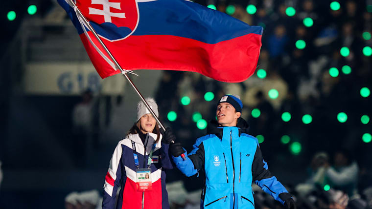 Michal Adamov (Biahthlon & Cross-Country Skiing) and Tamara Mesikova (Ski Jumping) carry the flag into the stadium for the Slovakia Youth Olympic Team during the Opening Ceremony at the Gangneung Oval. The Winter Youth Olympic Games, Gangwon, Republic of Korea, Friday 19 January 2024.