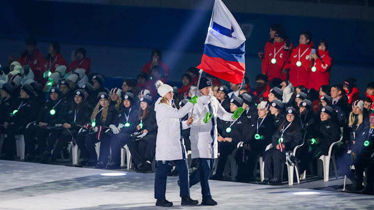 Miha Oserban (Alpine Skiing) and Taja Bodlaj (Ski Jumping) carry the flag into the stadium for the Slovenia Youth Olympic Team during the Opening Ceremony at the Gangneung Oval. The Winter Youth Olympic Games, Gangwon, Republic of Korea, Friday 19 January 2024.