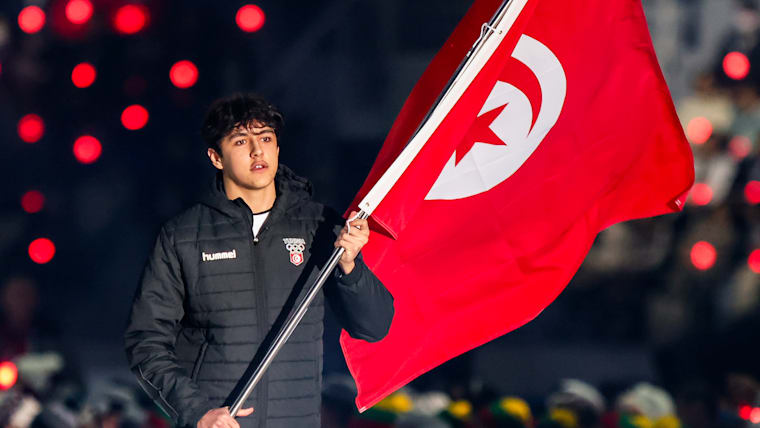 Jonathan Lourimi (Bobsleigh) carries the flag into the stadium for the Tunisia Youth Olympic Team during the Opening Ceremony at the Gangneung Oval. The Winter Youth Olympic Games, Gangwon, Republic of Korea, Friday 19 January 2024.