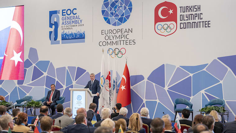 IOC / Greg Martin. President Bach addressing the 52nd EOC General Assembly in Istanbul.