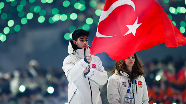 Muhammed Bozdag (Short Track Speed Skating) and Sidre Haciomanoglu (Ice Hockey) carry the flag into the stadium for the Türkiye Youth Olympic Team during the Opening Ceremony at the Gangneung Oval. The Winter Youth Olympic Games, Gangwon, Republic of Korea, Friday 19 January 2024.