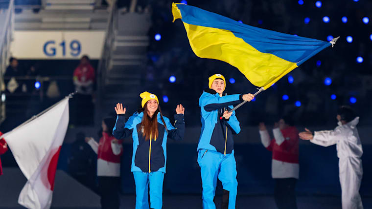Yaroslav Lavreniuk (Skeleton) and Valeriia Sheihas (Biathlon) carry the flag into the stadium for the Ukraine Youth Olympic Team during the Opening Ceremony at the Gangneung Oval. The Winter Youth Olympic Games, Gangwon, Republic of Korea, Friday 19 January 2024.
