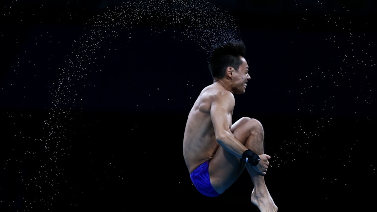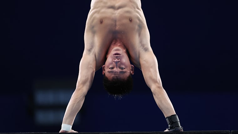 TOKYO, JAPAN - AUGUST 06: Jian Yang of Team China competes in the Men's 10m Platform preliminaries on day fourteen of the Tokyo 2020 Olympic Games at Tokyo Aquatics Centre on August 06, 2021 in Tokyo, Japan. (Photo by Al Bello/Getty Images)