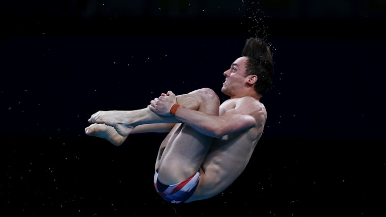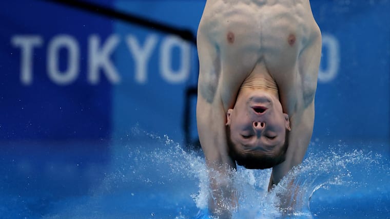 TOKYO, JAPAN - AUGUST 06: Tom Daley of Team Great Britain competes in the Men's 10m Platform preliminaries on day fourteen of the Tokyo 2020 Olympic Games at Tokyo Aquatics Centre on August 06, 2021 in Tokyo, Japan. (Photo by Al Bello/Getty Images)