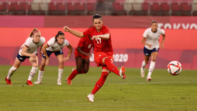 KASHIMA, JAPAN - AUGUST 02: Jessie Fleming #17 of Team Canada scores their side's first goal from the penalty spot during the Women's Semi-Final match between USA and Canada on day ten of the Tokyo Olympic Games at Kashima Stadium on August 02, 2021 in Kashima, Ibaraki, Japan. (Photo by Naomi Baker/Getty Images)