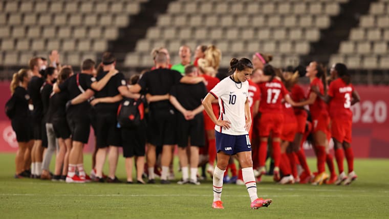 KASHIMA, JAPAN - AUGUST 02: Carli Lloyd #10 of Team United States looks dejected following defeat in the Women's Semi-Final match between USA and Canada on day ten of the Tokyo Olympic Games at Kashima Stadium on August 02, 2021 in Kashima, Ibaraki, Japan. (Photo by Francois Nel/Getty Images)