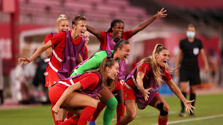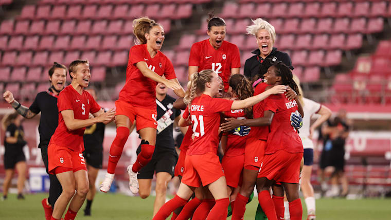 KASHIMA, JAPAN - AUGUST 02: Players of Team Canada celebrate their side's first goal scored by Jessie Fleming #17 of Team Canada (not pictured) during the Women's Semi-Final match between USA and Canada on day ten of the Tokyo Olympic Games at Kashima Stadium on August 02, 2021 in Kashima, Ibaraki, Japan. (Photo by Naomi Baker/Getty Images)