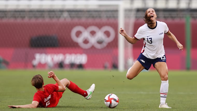 KASHIMA, JAPAN - AUGUST 02: Alex Morgan #13 of Team United States reacts after a challenge by Quinn #5 of Team Canada during the Women's Semi-Final match between USA and Canada on day ten of the Tokyo Olympic Games at Kashima Stadium on August 02, 2021 in Kashima, Ibaraki, Japan. (Photo by Francois Nel/Getty Images)
