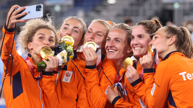 TOKYO, JAPAN - AUGUST 06: Team Netherlands pose for a selfie with their Gold Medals during the Victory Ceremony following the Women's Gold Medal match between Netherlands and Argentina on day fourteen of the Tokyo 2020 Olympic Games at Oi Hockey Stadium on August 06, 2021 in Tokyo, Japan. (Photo by Alexander Hassenstein/Getty Images)