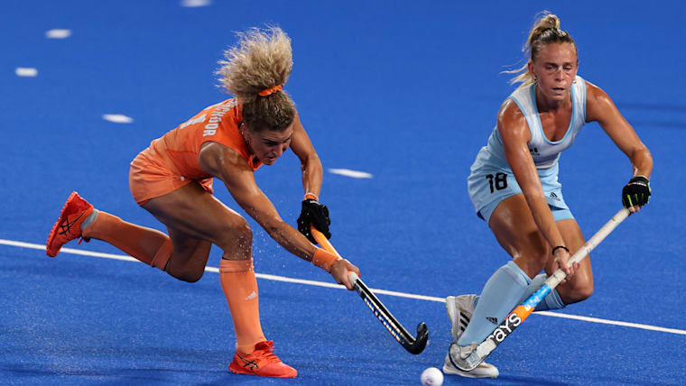 TOKYO, JAPAN - AUGUST 06: Maria Verschoor of Team Netherlands and Victoria Sauze Valdez of Team Argentina battle for the ball during the Women's Gold Medal match between Netherlands and Argentina on day fourteen of the Tokyo 2020 Olympic Games at Oi Hockey Stadium on August 06, 2021 in Tokyo, Japan. (Photo by Clive Mason/Getty Images)