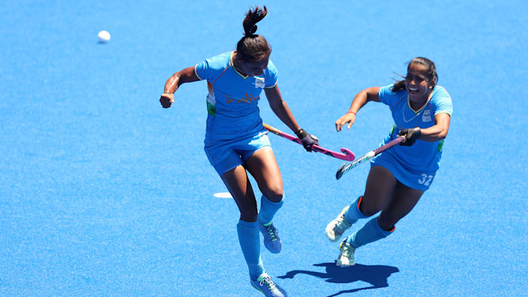 TOKYO, JAPAN - AUGUST 06: Vandana Katariya of Team India celebrates scoring their third goal with Neha Neha during the Women's Bronze medal match between Great Britain and India on day fourteen of the Tokyo 2020 Olympic Games at Oi Hockey Stadium on August 06, 2021 in Tokyo, Japan. (Photo by Alexander Hassenstein/Getty Images)