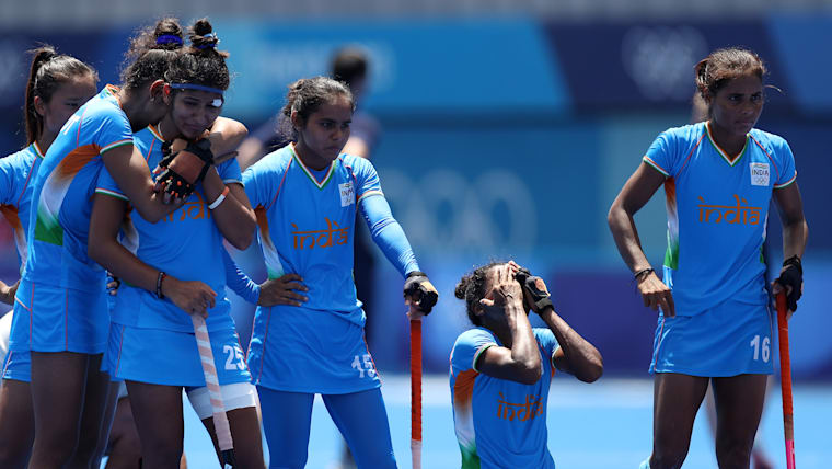 TOKYO, JAPAN - AUGUST 06: Navneet Kaur, Nisha, Salima Tete, and Vandana Katariya of Team India react following their loss in the Women's Bronze medal match between Great Britain and India on day fourteen of the Tokyo 2020 Olympic Games at Oi Hockey Stadium on August 06, 2021 in Tokyo, Japan. (Photo by Clive Mason/Getty Images)