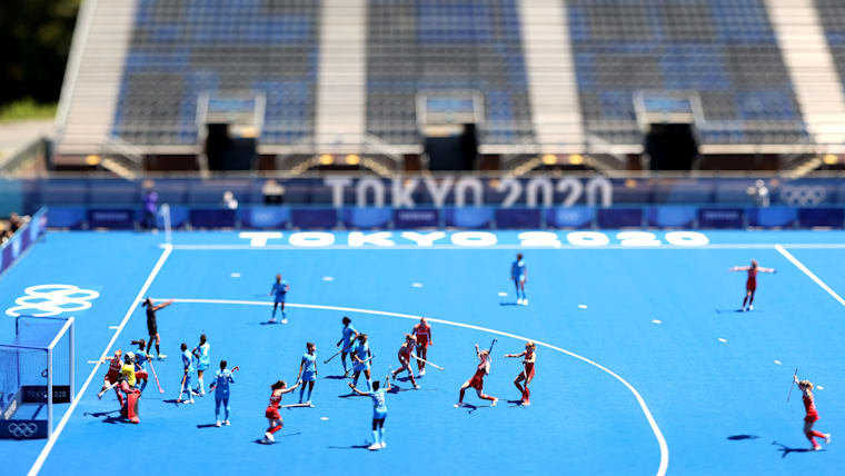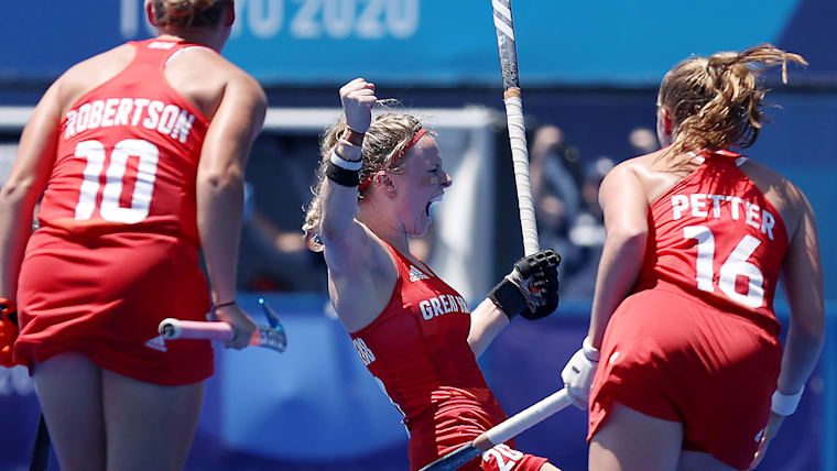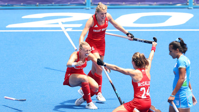 TOKYO, JAPAN - AUGUST 06: (EDITORS NOTE: Image was created using a variable planed lens.) Team captain Hollie Pearne-Webb (C) of Team Great Britain celebrates scoring the 3rd goal during the Women's Bronze medal match between Great Britain and India on day fourteen of the Tokyo 2020 Olympic Games at Oi Hockey Stadium on August 06, 2021 in Tokyo, Japan. (Photo by Alexander Hassenstein/Getty Images)