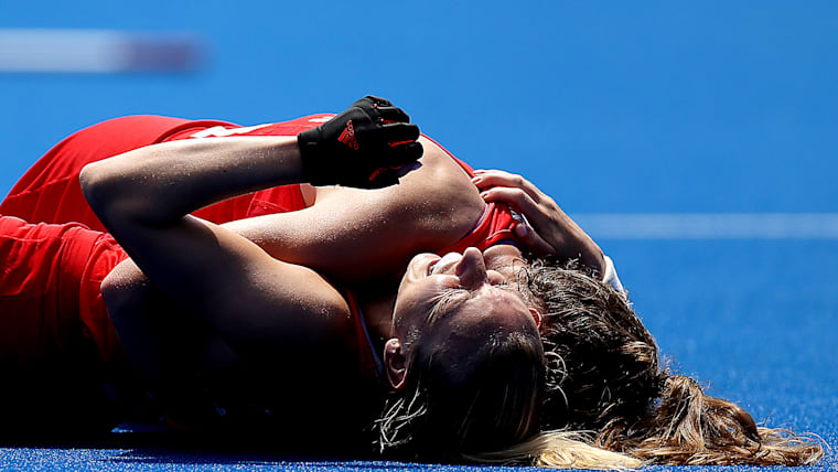 TOKYO, JAPAN - AUGUST 06: Shona McCallin and Hannah Martin of Team Great Britain celebrate their win following the Women's Bronze medal match between Great Britain and India on day fourteen of the Tokyo 2020 Olympic Games at Oi Hockey Stadium on August 06, 2021 in Tokyo, Japan. (Photo by Clive Mason/Getty Images)