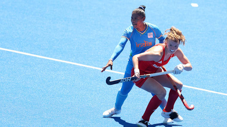 TOKYO, JAPAN - AUGUST 06: Isabelle Petter of Team Great Britain and Nisha of Team India battle for a loose ball during the Women's Bronze medal match between Great Britain and India on day fourteen of the Tokyo 2020 Olympic Games at Oi Hockey Stadium on August 06, 2021 in Tokyo, Japan. (Photo by Alexander Hassenstein/Getty Images)