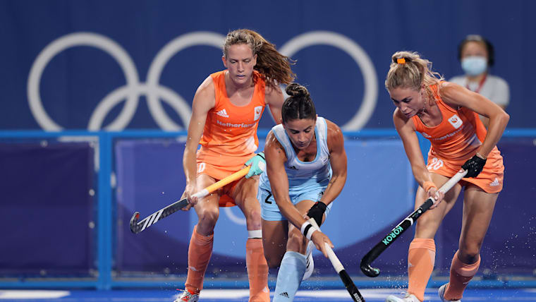 TOKYO, JAPAN - AUGUST 06: Felice Albers and Laura Maria Nunnink of Team Netherlands battle for the ball with Maria Victoria Granatto of Team Argentina during the Women's Gold Medal match between Netherlands and Argentina on day fourteen of the Tokyo 2020 Olympic Games at Oi Hockey Stadium on August 06, 2021 in Tokyo, Japan. (Photo by Alexander Hassenstein/Getty Images)