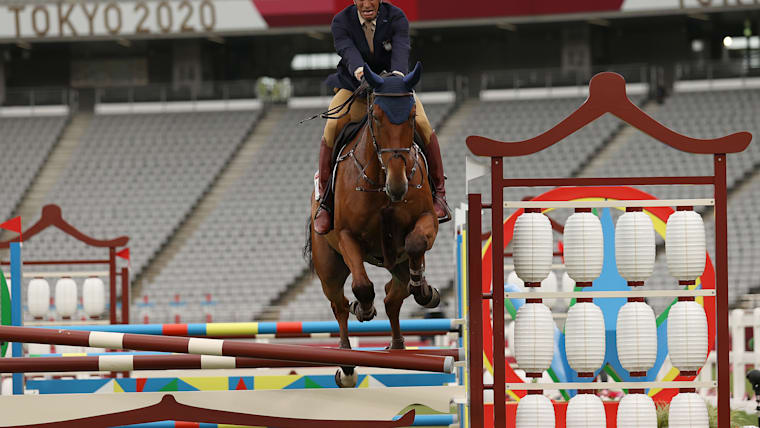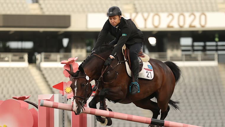 CHOFU, JAPAN - AUGUST 07: Pavel Ilyashenko of Team Kazakhstan competes Riding Show Jumping of the Men's Modern Pentathlon on day fifteen of the Tokyo 2020 Olympic Games at Tokyo Stadium on August 07, 2021 in Chofu, Japan. (Photo by Dan Mullan/Getty Images)