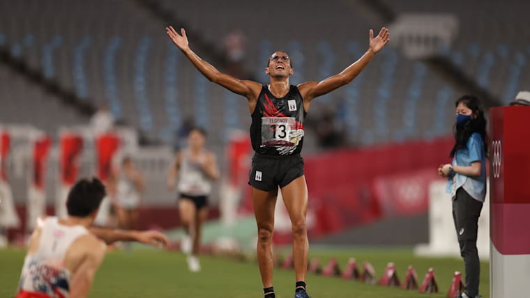 CHOFU, JAPAN - AUGUST 07: (EDITOR'S NOTE: Retransmission alternate crop) Ahmed Elgendy of Team Egypt crosses the finish line in the Laser Run and celebrates winning the silver medal of the Men's Modern Pentathlon on day fifteen of the Tokyo 2020 Olympic Games at Tokyo Stadium on August 07, 2021 in Chofu, Japan. (Photo by Dan Mullan/Getty Images)