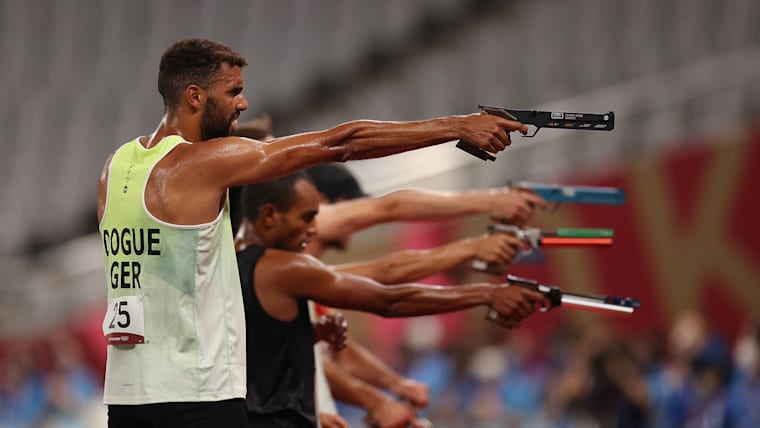 CHOFU, JAPAN - AUGUST 07: Patrick Dogue of Team Germany competes in the Laser Run of the Men's Modern Pentathlon on day fifteen of the Tokyo 2020 Olympic Games at Tokyo Stadium on August 07, 2021 in Chofu, Japan. (Photo by Dan Mullan/Getty Images)