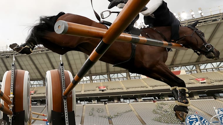 CHOFU, JAPAN - AUGUST 07: Charles Fernandez of Team Guatemala collides with a jump in the Riding Show Jumping of the Men's Modern Pentathlon on day fifteen of the Tokyo 2020 Olympic Games at Tokyo Stadium on August 07, 2021 in Chofu, Japan. (Photo by Dan Mullan/Getty Images)