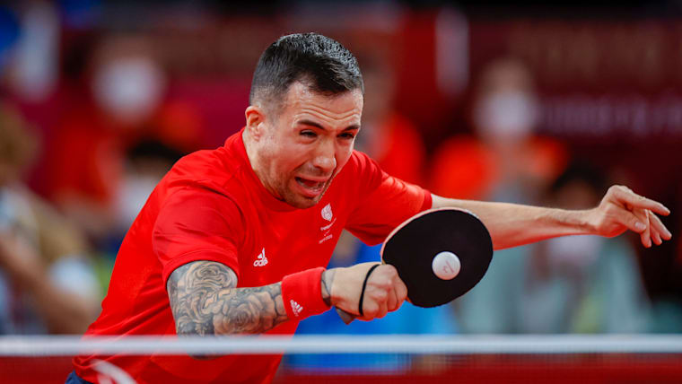 TOKYO, JAPAN - AUGUST 29: Will Bayley of Team Great Britain competes with Yan Shuo of Team China in mens singles class 7 gold medal match table tennis on day 5 of the Tokyo 2020 Paralympic Games at Tokyo Metropolitan Gymnasium on August 29, 2021 in Tokyo, Japan. (Photo by Tasos Katopodis/Getty Images)