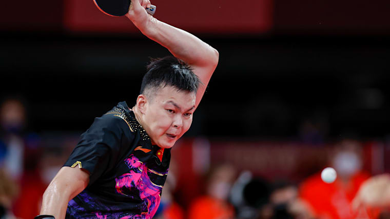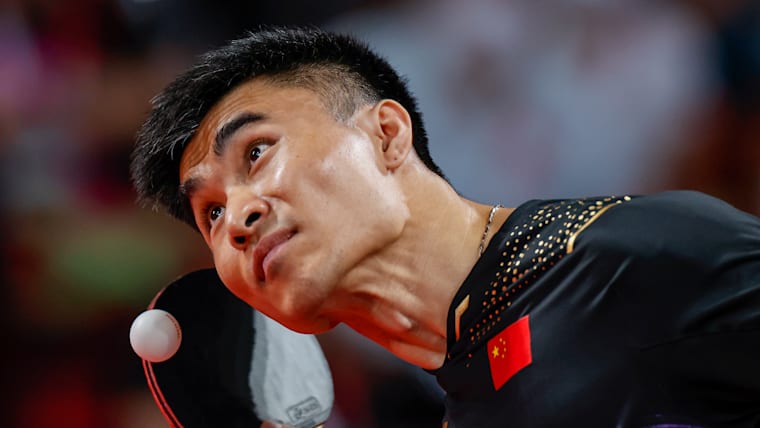 TOKYO, JAPAN - AUGUST 29: Ningning Cao of Team China competes against Valentin Baus of Team Germany in mens singles class 5 gold medal match table tennis on day 5 of the Tokyo 2020 Paralympic Games at Tokyo Metropolitan Gymnasium on August 29, 2021 in Tokyo, Japan. (Photo by Tasos Katopodis/Getty Images)