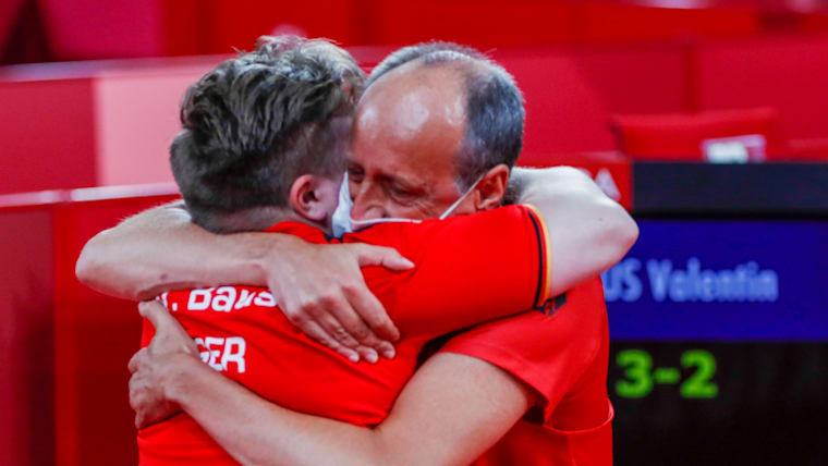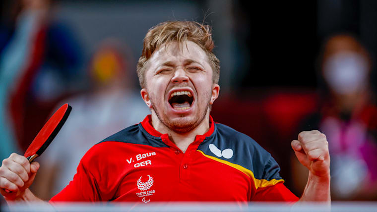 TOKYO, JAPAN - AUGUST 29: Valentin Baus of Team Germany reacts to winning gold against Ningning Cao of Team China in mens singles class 5 gold medal match table tennis on day 5 of the Tokyo 2020 Paralympic Games at Tokyo Metropolitan Gymnasium on August 29, 2021 in Tokyo, Japan. (Photo by Tasos Katopodis/Getty Images)