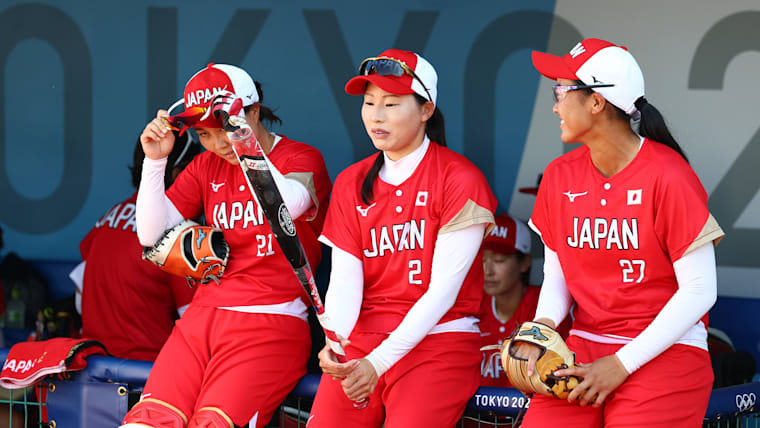FUKUSHIMA, JAPAN - JULY 21: (L-R) Nayu Kiyohara #21, Saki Yamazaki #2 and Miu Goto #27 of Team Japan look on prior to their game against Team Australia during the Tokyo 2020 Olympic Games at Fukushima Azuma Baseball Stadium on July 21, 2021 in Fukushima, Japan. (Photo by Yuichi Masuda/Getty Images)