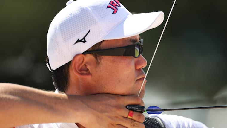 TOKYO, JAPAN - JULY 23: Yuki Kawata of Team Japan competes in the Men's Individual Ranking Round during the Tokyo 2020 Olympic Games at Yumenoshima Park Archery Field on July 23, 2021 in Tokyo, Japan. (Photo by Justin Setterfield/Getty Images)