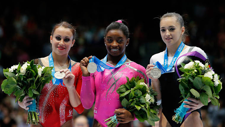 Simone Biles wins floor gold in 2013. Italy's Vanessa Ferrari, left, was the silver medalist. Romania's Larisa Iordache took bronze.