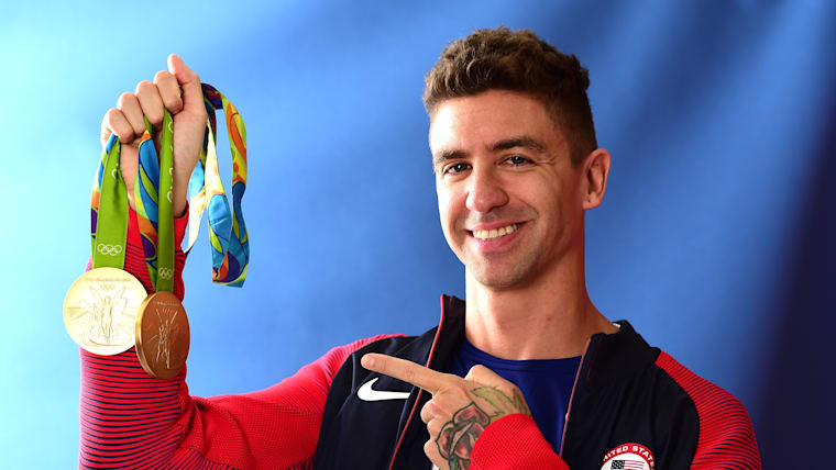 USA swimmer Anthony Ervin shows off two Olympic gold medals