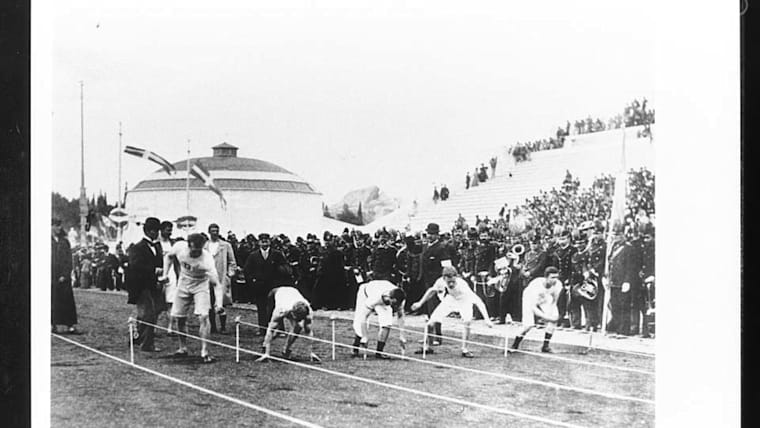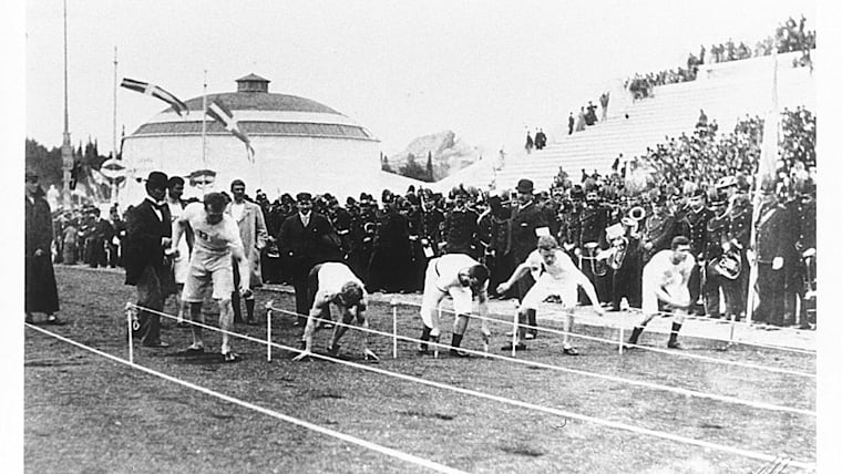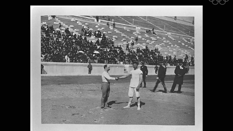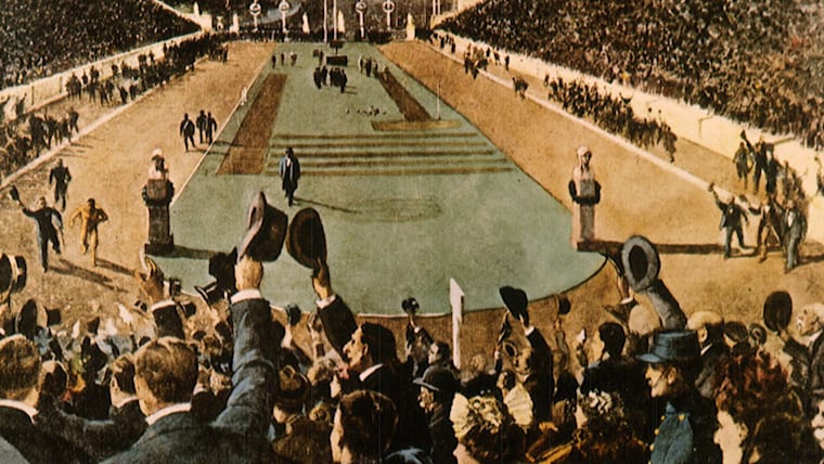 Apr 1896: A painting shows Spiridon Louis of Greece winning the first Olympic marathon in 1896. It was the culmination of a triumph for the Greek hosts that one of their countrymen in running from the village of Marathon along the coast from Athens shouldachieve victory. Mandatory Credit: IOC/Allsport