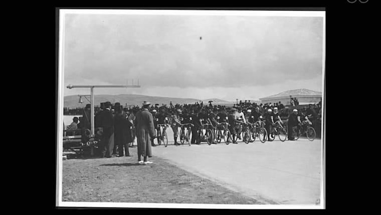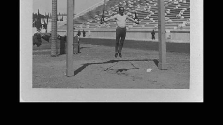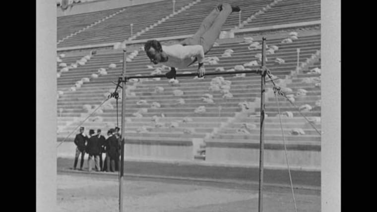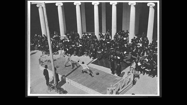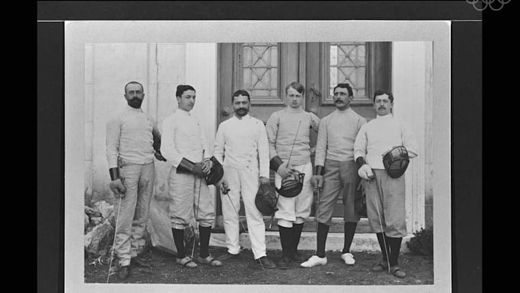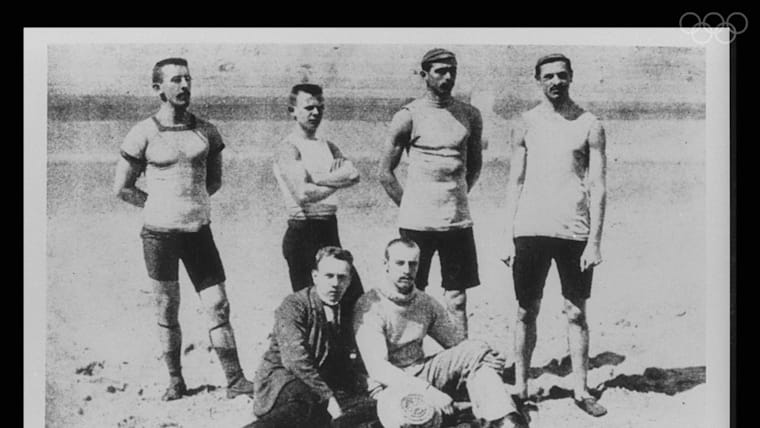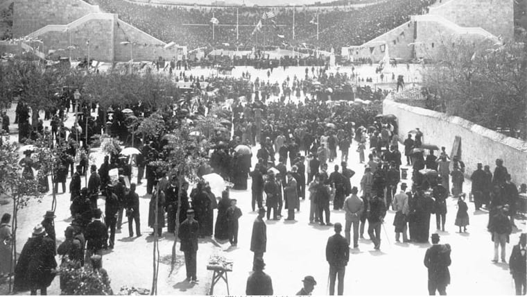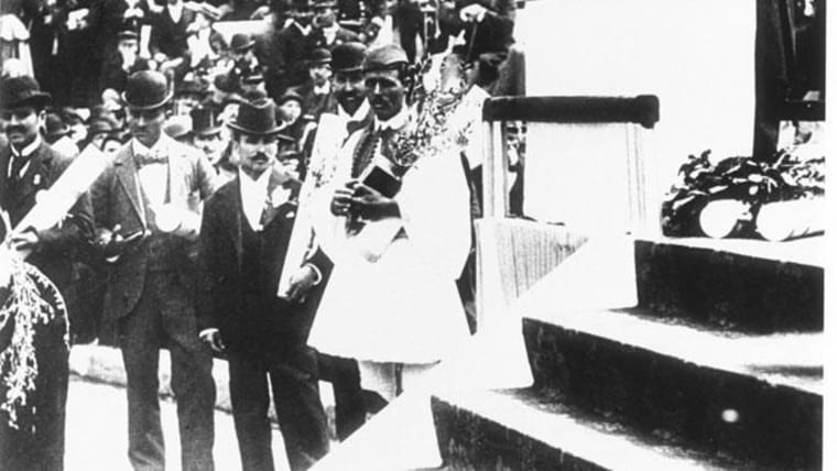 3 Apr 1896: Louis Spiridon (centre) of Greece receives his gold medal at the medal ceremony for winning the Marathon event during the 1896 Olympic Games in Athens, Greece. \ Mandatory Credit: IOC/Olympic Museum /Allsport