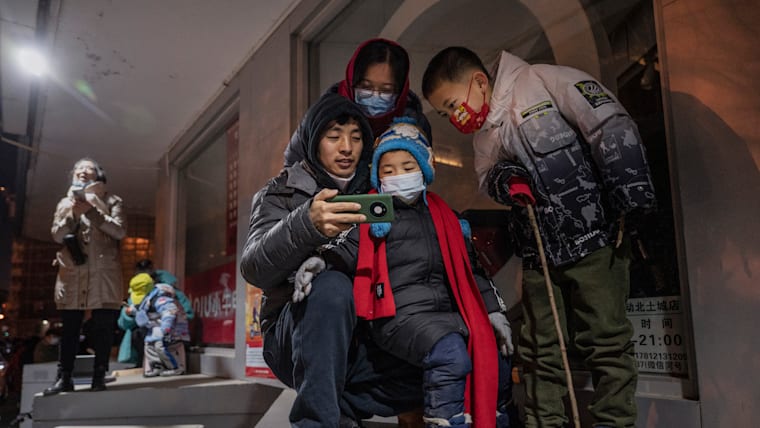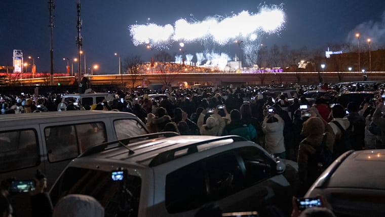Beijing locals watch fireworks of Opening Ceremony while viewing TV coverage on mobile devices