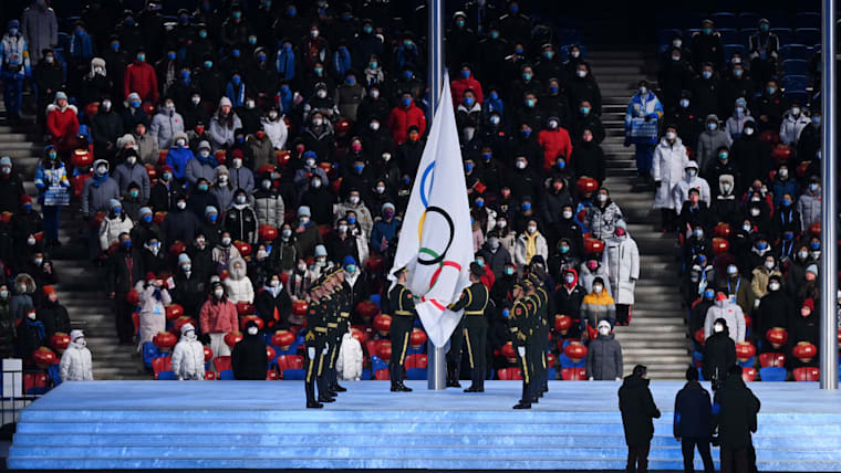 BEIJING, CHINA - FEBRUARY 20: The flag of the IOC is hoisted during the Beijing 2022 Winter Olympics Closing Ceremony on Day 16 of the Beijing 2022 Winter Olympics at Beijing National Stadium on February 20, 2022 in Beijing, China. (Photo by David Ramos/Getty Images)