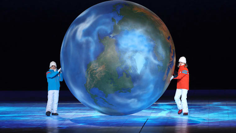 BEIJING, CHINA - FEBRUARY 20: Children representing Milan and Cortina hug a globe as part of the handover ceremony during the Beijing 2022 Winter Olympics Closing Ceremony on Day 16 of the Beijing 2022 Winter Olympics at Beijing National Stadium on February 20, 2022 in Beijing, China. (Photo by Lintao Zhang/Getty Images)