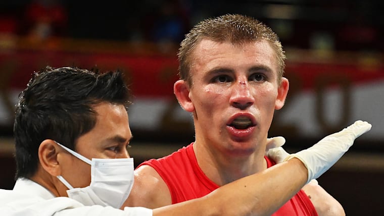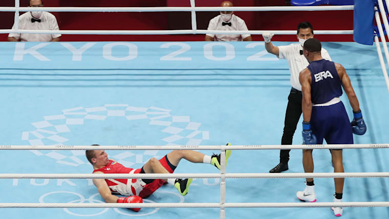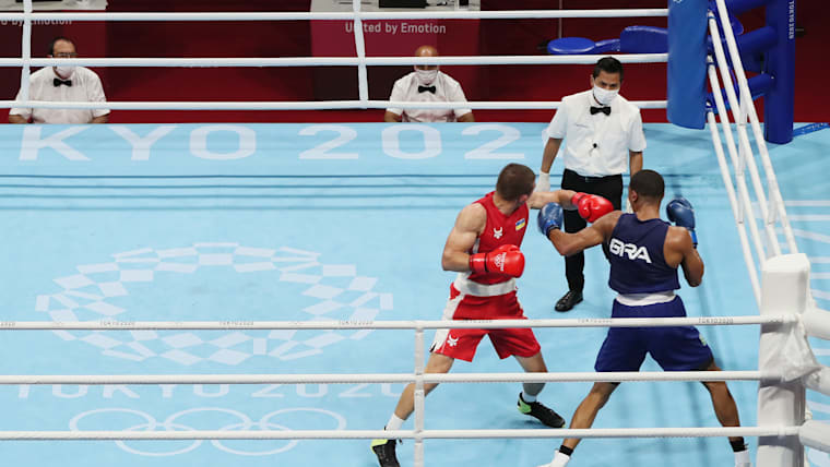 TOKYO, JAPAN - AUGUST 07: Herbert Sousa of Team Brazil knocks out Oleksandr Khyzhniak of Team Ukraine during the Men's Middle (69-75kg) Final bout between Oleksandr Khyzhniak of Team Ukraine and Herbert Sousa of Team Brazil on day fifteen of the Tokyo 2020 Olympic Games at Kokugikan Arena on August 07, 2021 in Tokyo, Japan. (Photo by Buda Mendes/Getty Images)