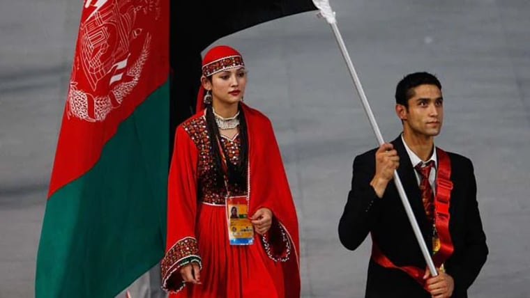 BEIJING - AUGUST 08: Nesar Ahmad Bahave of Afghanistan carries his country's flag during the Opening Ceremony for the 2008 Beijing Summer Olympics at the National Stadium on August 8, 2008 in Beijing, China.