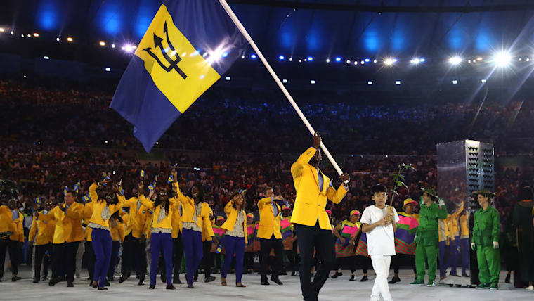 Flag Bearer Ramon GITTENS of Barbados leads out his country during the Opening Ceremony of the Rio 2016 Olympic Games at Maracana Stadium, Rio de Janeiro, Brazil.