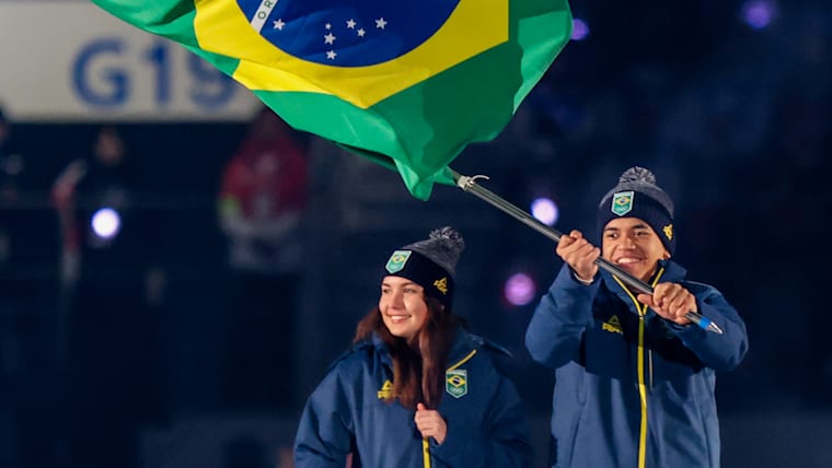 Andre Luiz Dos Santos Alves Da Silva (Bobsleigh) and Alice Padilha (Alpine Skiing) carry the flag into the stadium for the Brazil Youth Olympic Team during the Opening Ceremony at the Gangneung Oval. The Winter Youth Olympic Games, Gangwon, Republic of Korea, Friday 19 January 2024.