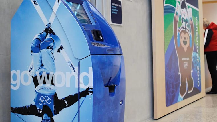 IOC - An athlete from Team Usa tries on the merchandise at a mirror branded by Visa at the plaza in the Beijing Olympic Village in China