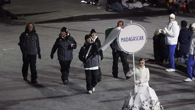 The delegation of Madagascar (MAD)-Flag-bearer: Mathieu RAZANAKOLONA (Alpine Skiing).