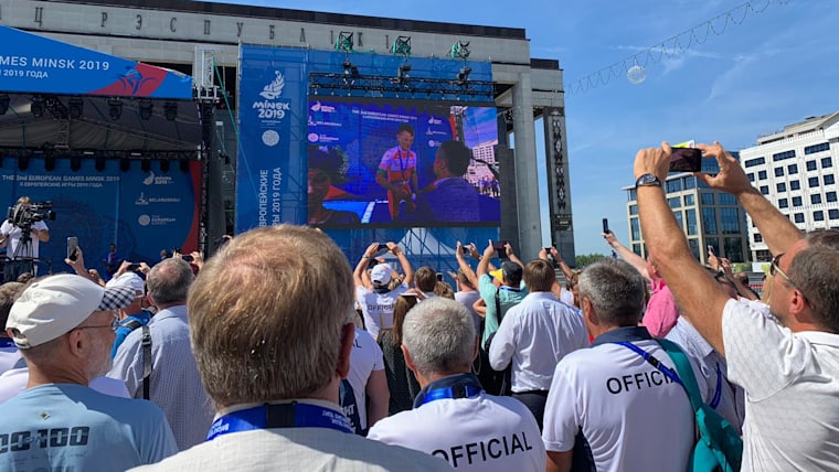 Vasil Kiryienka gets the party started in Minsk at the 2019 European Games. Photo: Olympic Channel