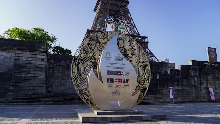 Il countdown Olimpico con i cerchi Olimpici sulla Torre Eiffel sullo sfondo
