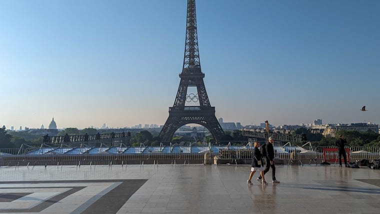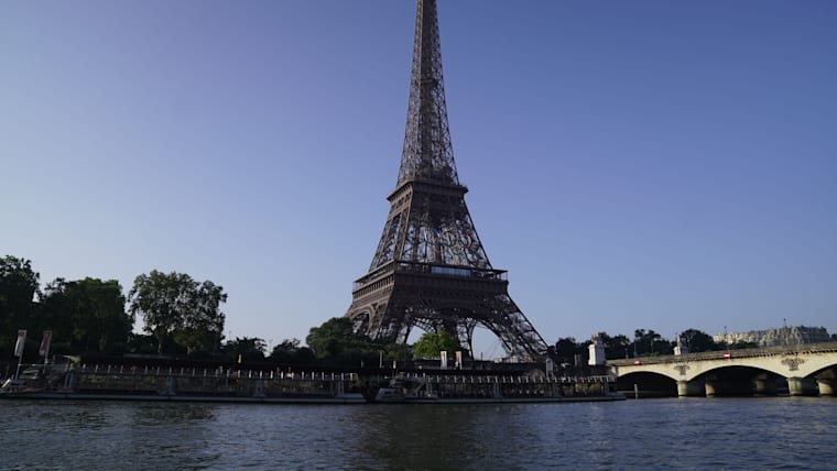 La Torre Eiffel addobbata con i cerchi Olimpici, 7 giugno 2024.