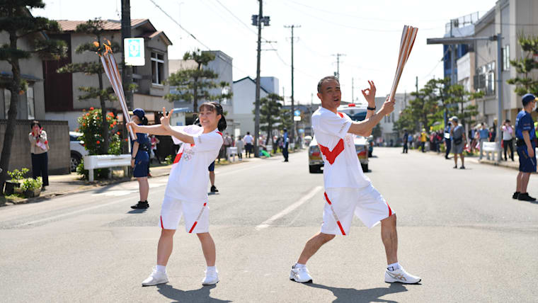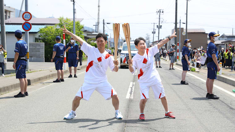 Akita, JAPAN - 9 JUNE, 2021 : The Olympic Torch Relay section 4 in Noshiro City, Akita prefecture, Japan.