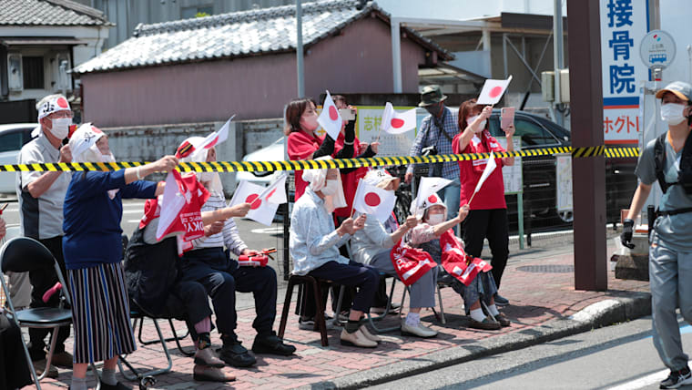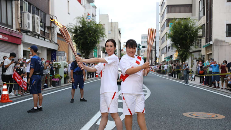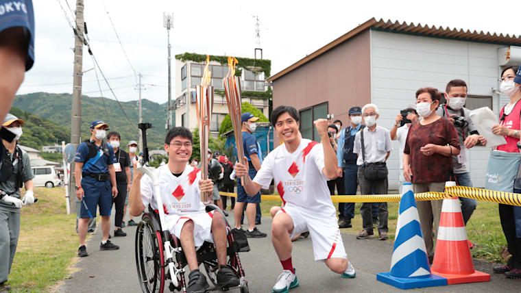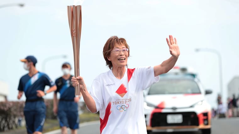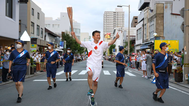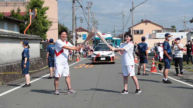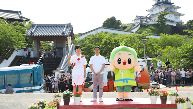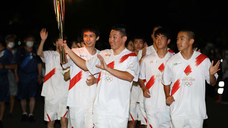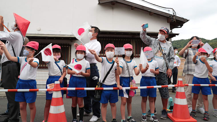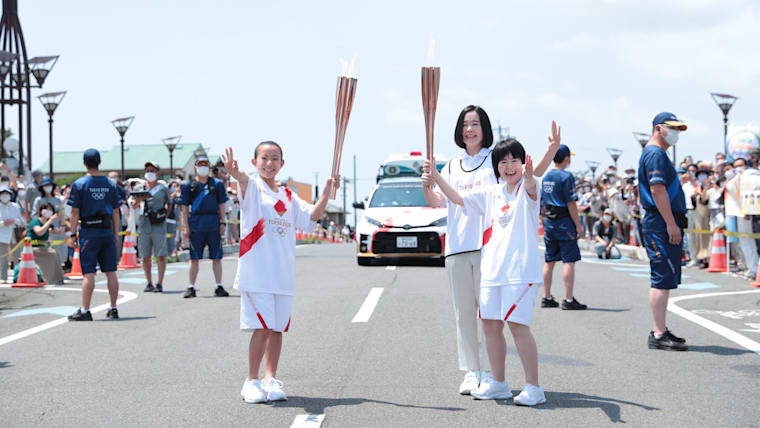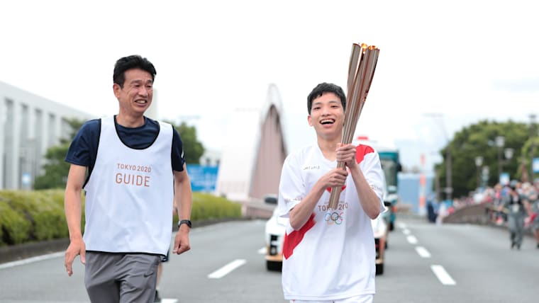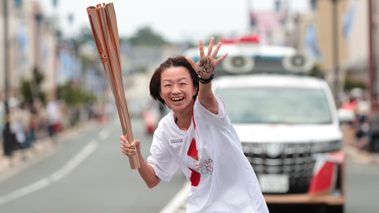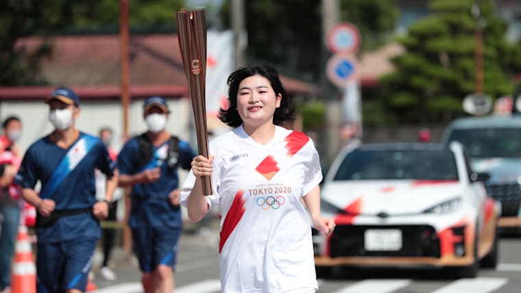 A torchbearer shows her palm that reads 'arigatou' ('thank you').